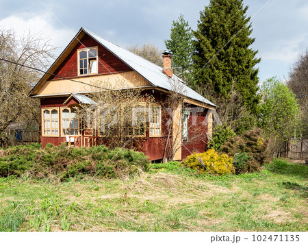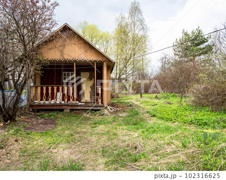 wooden summer house in village in early spring