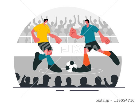 Futsal, Soccer, or Football Vector Illustration Featuring Players Shooting and Dribbling the Ball in a Championship Sports Scene with a Background