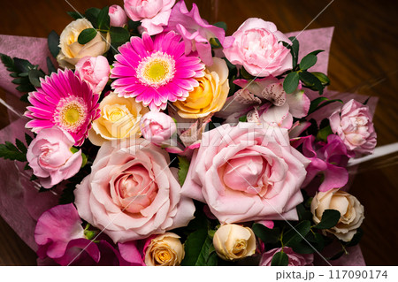Soft focus to pink rose bud growing in flower pot with blurred background