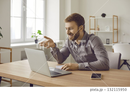 Smiling businessman sitting at the desk and having video call on a laptop in the office.