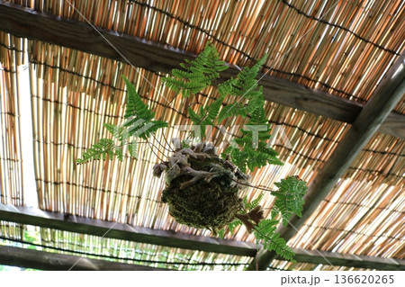 室內採用自然風格,竹製天花板下懸掛著苔蘚球和蕨類植物。