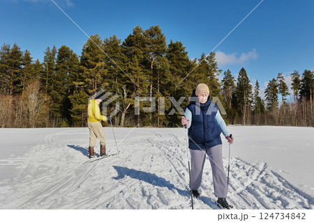 Middle aged couple enjoys cross country skiing, woman skiing towards camera while man trails, both gliding over snow with poles in sunny open field.