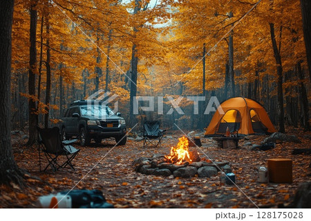 An SUV parked next to a campfire in a natural setting with camping chairs and supplies scattered around