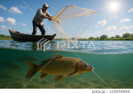AI generated ultra realistic underwater carp farm with fisherman casting net from boat on sunny day showing nature fishing and rural life concept