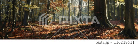 A peaceful forest filled with tall trees and scattered dry leaves, creating a tranquil natural atmosphere.