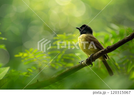 Bird sitting on a tree branch in a lush green forest. Wildlife photography.