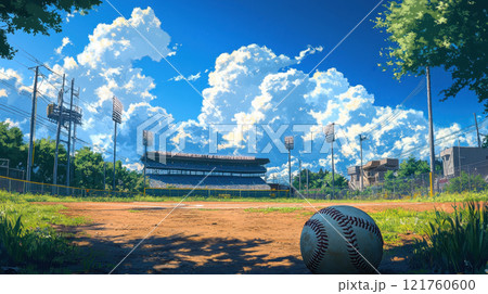 Scenic baseball field under a vibrant sky with fluffy clouds in an anime illustration, AI Generative