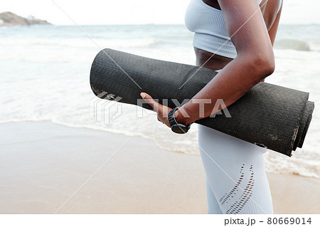 Female surfer walks along black sand beach while carrying surfboard against backdrop of ocean waves