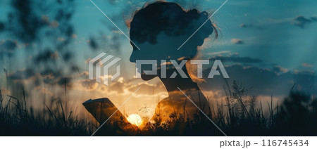 Woman teaching girl to ride bike, silhouettes at sunrise in field. Emotional support, participation, presence and encouragement from mother in learning process to help child overcome fear of failure.