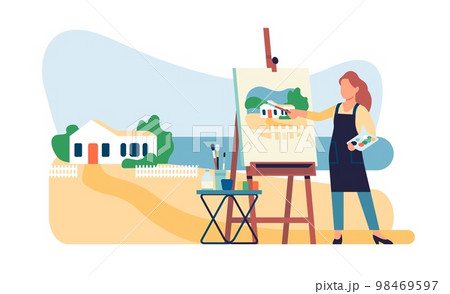 Woman artist paints picture of landscape in nature. Scenic beach panorama painting. Painter with easel canvas and paintbrush. Female drawing outdoor. Creative hobby. Vector concept