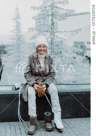 Senior woman sitting at christmas ice rinke in the city and puttion on white ice skates.