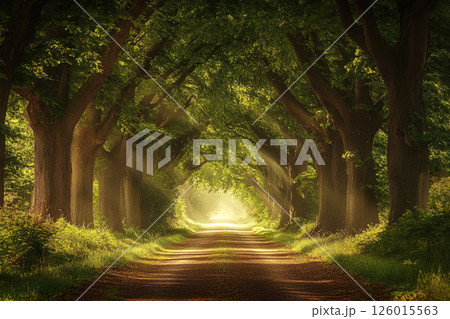 A winding road through a dense forest, illuminated by sunbeams filtering through lush foliage, creating a serene and enchanting atmosphere.