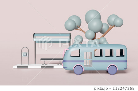 3d bus stop with passenger accommodation, tree isolated on pink background. public transportation concept, 3d illustration render