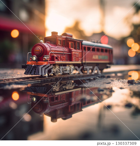 A close-up of a red toy train on a wet surface, reflecting the warm, glowing light of a sunset.