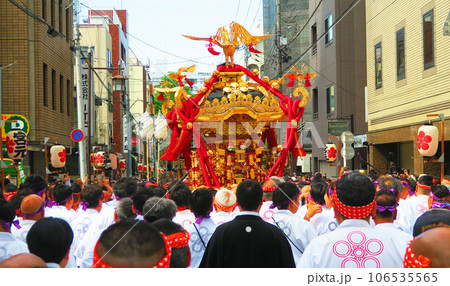 神戶市垂海區海神社的秋季祭典。神社入口場景,蒲團太鼓和神社教民奔跑
