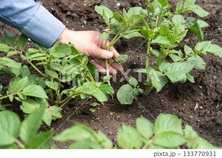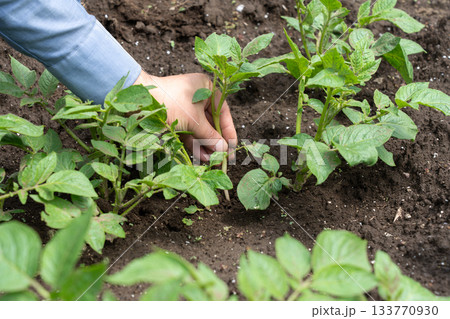 一名男子正在給發芽的馬鈴薯間苗。一名男子正在給馬鈴薯間苗。 (四月)家庭花園