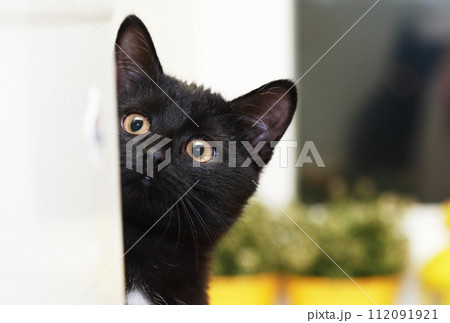Cat outdoors in snowy winter. Cat siting in snow near fir tree