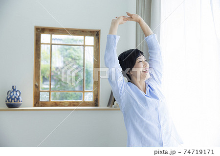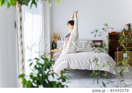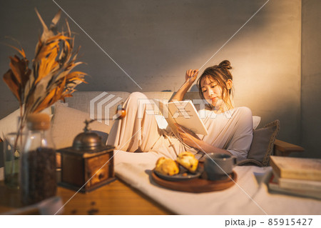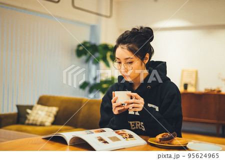 穿著牛仔褲的日本女人,雙腿交叉在房間的椅子上