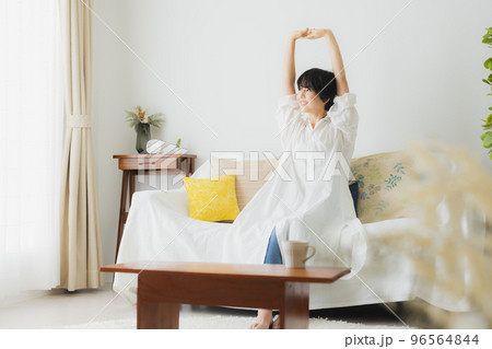 一個三十多歲的女人在串珠沙發上喝著酒放鬆