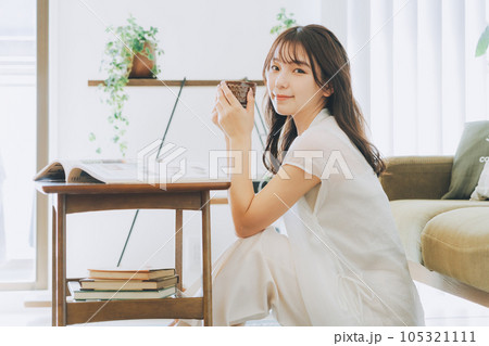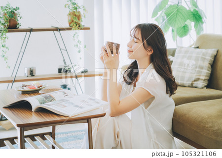 在客廳喝咖啡的女人