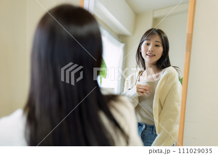 日本女人微笑著檢查她的劉海和髮型