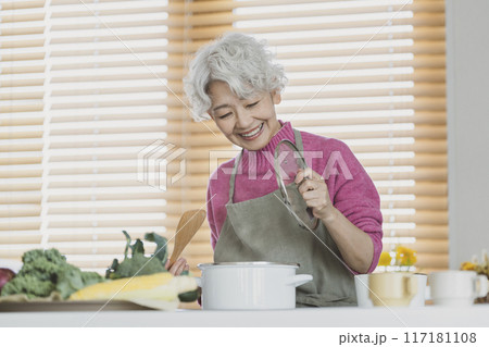 一位老年婦女做飯、對著鏡頭微笑的肖像