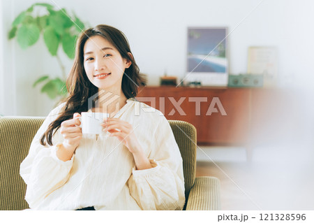 一個女人坐在沙發上,喝著咖啡