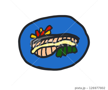晚餐主菜是盛在日式藍色盤子裡的鹽烤竹莢魚