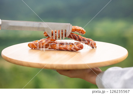 Hot grilled sausages on wooden board, sausage on the picnic, preparing barbecue, grill outdoors, copy space