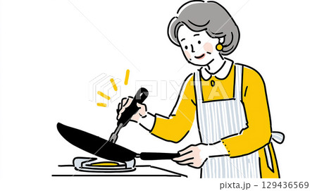 一位穿著條紋圍裙的老年婦女在煎鍋裡做飯的插圖