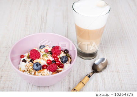 Healthy breakfast with muesli, milk, berries and coffee on textured background