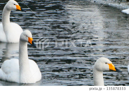 一群大天鵝在岩手縣盛岡市高松池越冬。