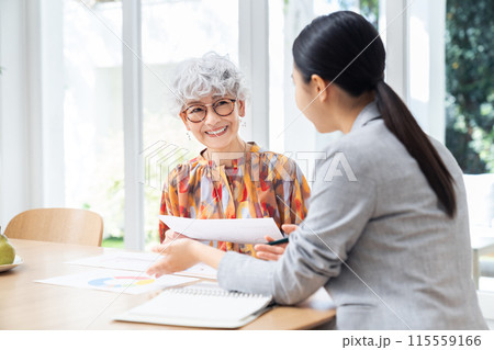 向富有的老年人出售產品的女商人
