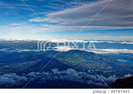 從富士山的山頂看到的朝霧高原和影子富士