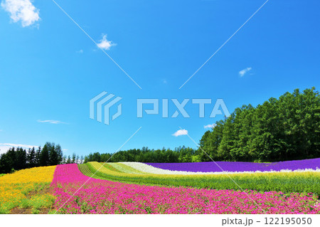 北海道夏天藍天和五顏六色的花田
