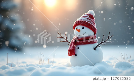 Snowman wearing a knitted hat and scarf in winter wonderland landscape