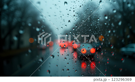 A rainy city street view through a wet window. The atmosphere is moody and cold.