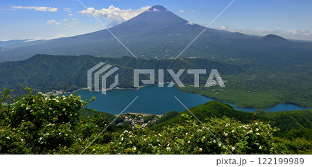 從野玫瑰盛開的御坂山雪戸岳眺望富士山和西湖的全景