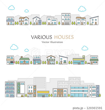 簡單可愛的商店、房屋和建築物等城市景觀的矢量插圖素材/房屋/房屋
