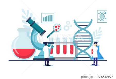 Genomics scene . Scientists are doing research in laboratory room . Genome therapy concept . Flat design . Vector .