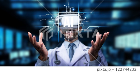Futuristic Scientist with Virtual Reality Headset Representing Artificial Intelligence and Technology Advancements in Modern Medical Research and Innovation. PHMT