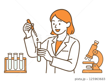 Illustration of modern laboratory setting, woman in lab coat is working with large, sophisticated orange robotic arm, image in flat retro style for laboratory equipment, robotics, related technology