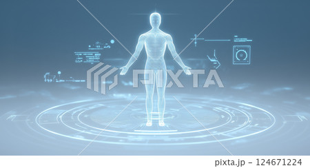 A futuristic doctor shows stethoscope and appear of advanced futuristic medicine symbols in holography.
