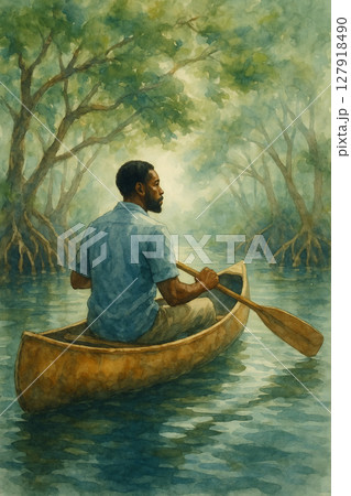 獨木舟上的孤獨旅人 | 熱帶水道與沉思時刻水彩畫 | 獨木舟旅行者的靜謐時光 | 連結自然與心靈的風景