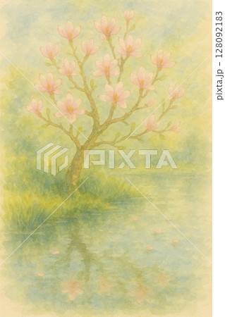 湖邊春木蘭 | 溫柔水彩風景插畫 春日湖畔與木蘭 | 溫柔水彩風格插畫
