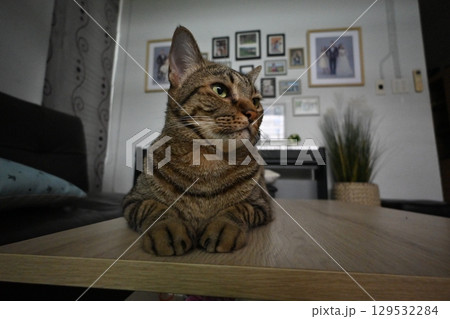 一隻貓在明亮的房間裡盯著你看