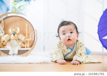 5月5日兒童節穿著袴的嬰兒與五月娃娃一起慶祝第一個五一節(第一節)