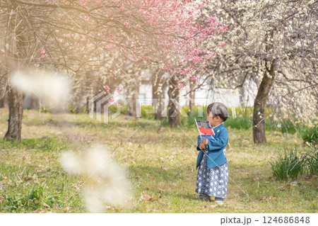 一個穿著紅色袴的可愛女嬰,在第一個節日的 Hinamatsuri 被春天的櫻花包圍著,看起來很開心