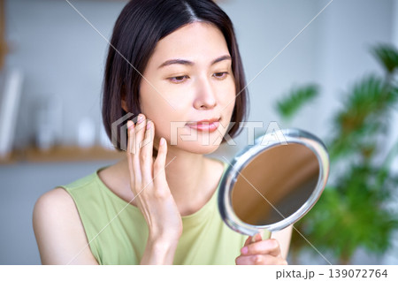 一位亞洲女性正在鏡子前檢查自己的皮膚狀況。