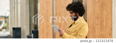 African American man standing outdoors, using tablet while leaning against wooden wall, appearing focused and engaged